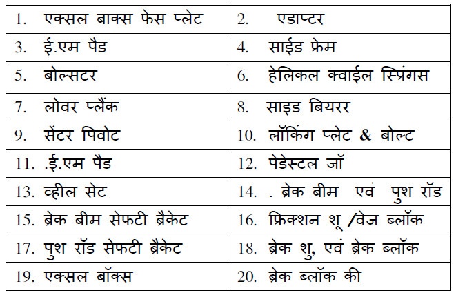 Wheel set with cartridge bearing ii. Side frames with friction plates Load bearing springs and snubber springs vii. Side frames with friction plates iv. Spring plank, fit bolts & rivets vi.